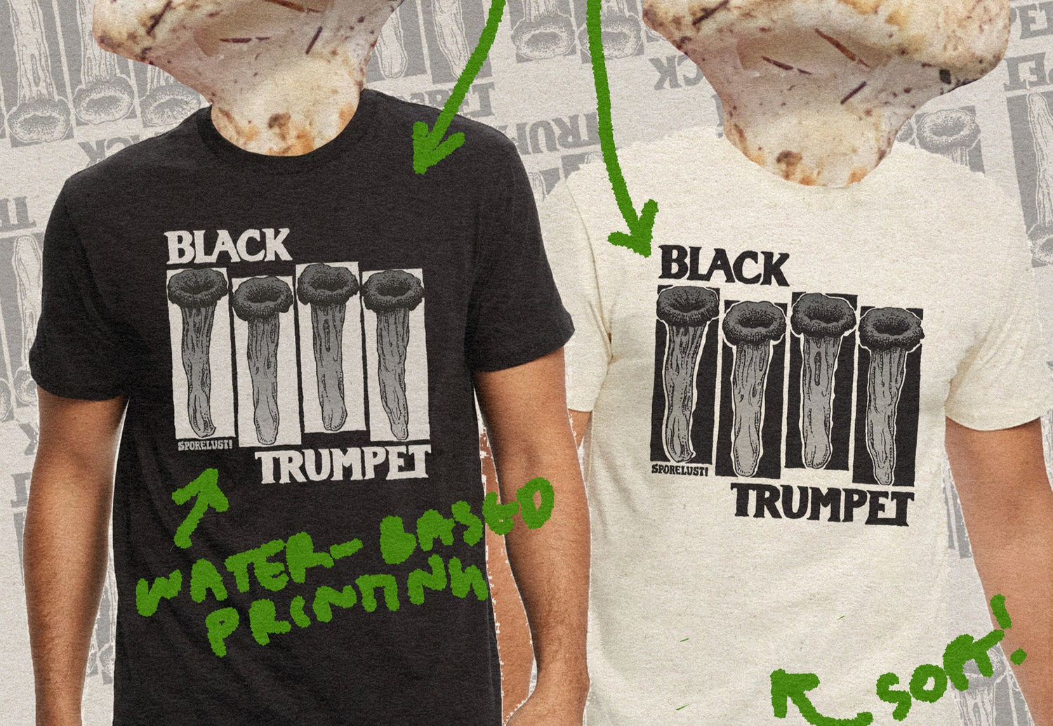 Sporelust! Yeller Mushroom Tee, Black Organic Cotton