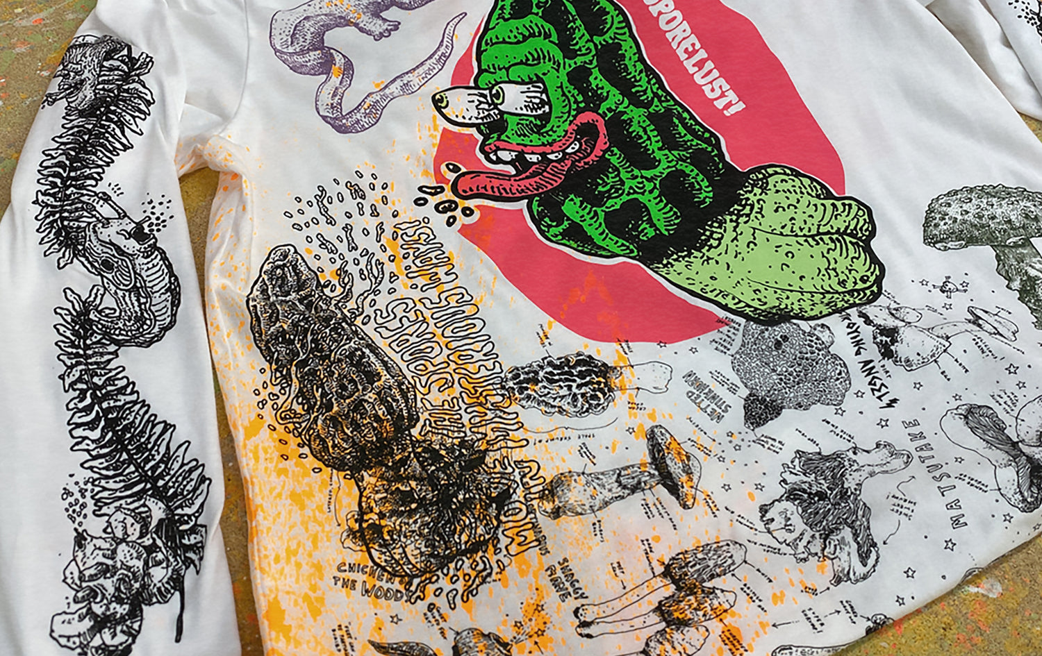 Our apparel is ethically sourced, hand printed, and art forward. All our goods feature artwork that wraps up everything we love about mushrooms, nature, 90s skate-punk vibes and 60s counterculture comics in one little, sometimes a bit deranged, packet.
