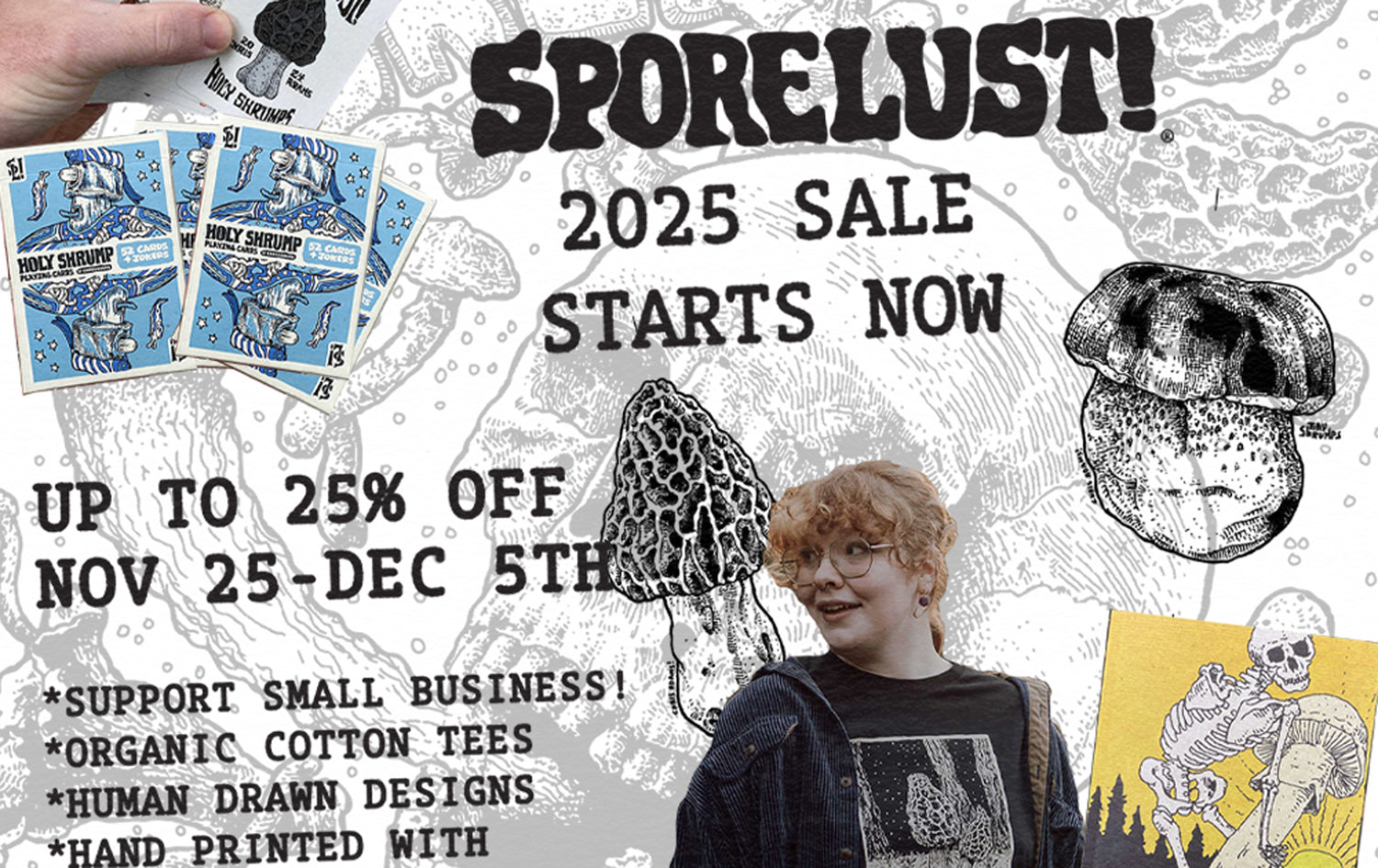 Our apparel is ethically sourced, hand printed, and art forward. All our goods feature artwork that wraps up everything we love about mushrooms, nature, 90s skate-punk vibes and 60s counterculture comics in one little, sometimes a bit deranged, packet.