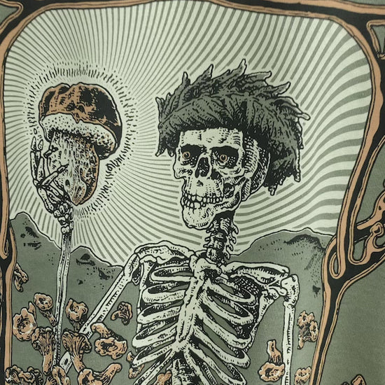 Features a Skeleton wearing a Fern Crown with a levitating Porcini (Boletus rubriceps) and the San Juan Mountains in the background. Other mushrooms pictured: Rainbow Chanterelle (Cantherellus roseacanus), Hawkswing (Sarcodon imbricatus), Calocera sp. and Amanita muscaria.