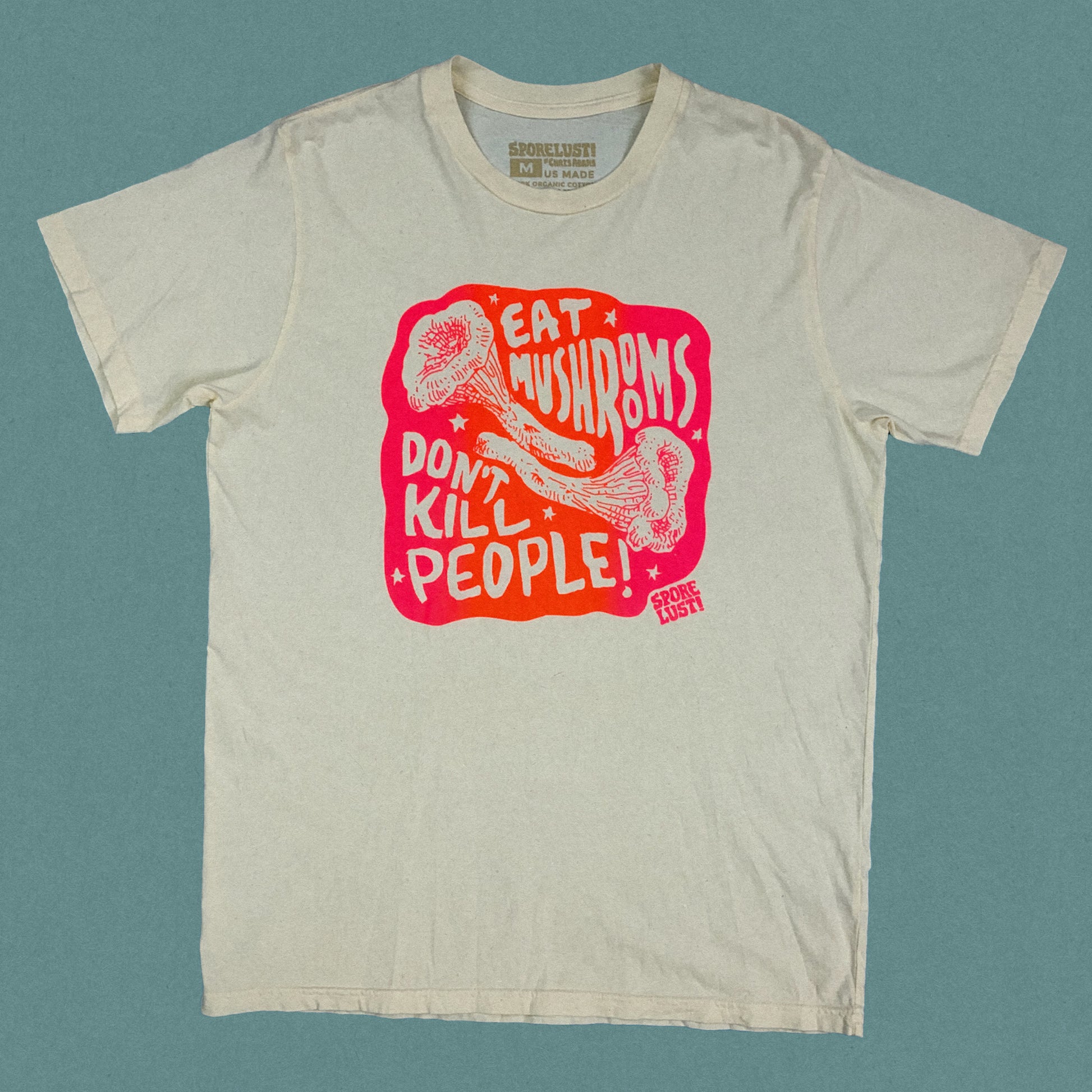 Love these new EMDKP tees with the neon pink & neon red gradient––called a "split fountain" to all us screen printers out there!! It's not only a rad tee, but it's great advice for life: Eat Mushrooms. Don't Kill People.