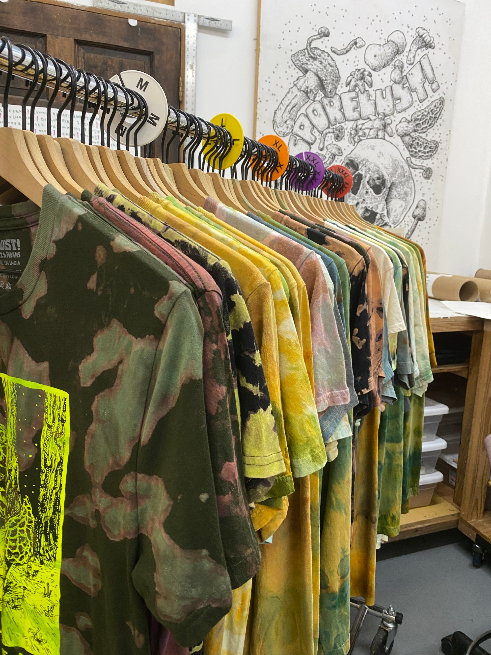 By far our most popular product at in-person events, now you can grab a custom dyed tee online! Often these tees feature multiple designs thoughtfully printed all over the tee, but feel free to leave us some ideas on your preference in the order notes. Choose your size & a light or dark base tee (typically this will be a cream tee or black tee), and we will pick you out a sweet one to throw over your torso!